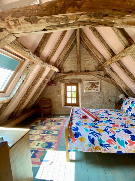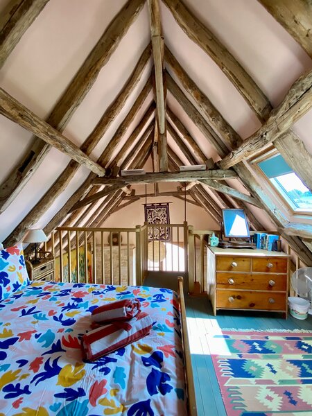 Upper floor: a cosy bedroom tucked under the eaves, reached via a simple oak staircase. Decorated with warm colours and rustic touches, The Dower is a peaceful spot for couples or a quiet escape from the main house.